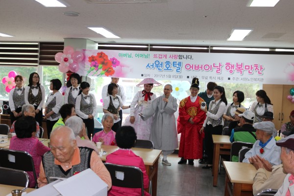 5월 8일 어버이날 서원노인복지관에서는 어버이날을 맞이하여 카네이션 달아드리기, 점심 무료 특식 제공행사를 진행하였습니다. 서원호텔 어버이날 행복만찬을 주제로 직원들이 호텔의 직원으로써 어르신들에게 가장 귀한 대접을 한다는 의미를 가졌으며 한옥마을 비빔한복에서 한복을 무료로 대여해주셔서 직원들이 직접 한복을 입고 어르신들께 즐거움과 좋은 추억을 선사하였습니다..