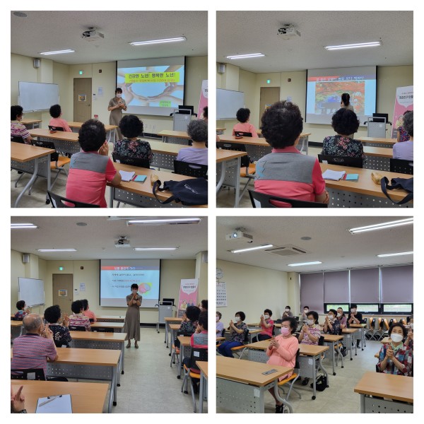 기린봉노인복지관에서는 AIP(Aging In Place) 지원 프로그램, 서로 돌보고 함께 배우는 "청춘 친구 만들기" 프로그램 8회기를 진행하였습니다. 8회기에는 외부강사를 통해 노인건강증진특강을 진행하였습니다. 강의 주제에 맞게 ‘건강하게 100세 살기’에 대한 내용과 노인 질병의 증상 및 예방법에 대한 정보전달의 시간을 가졌습니다. 노인의 질병은 신체적 질병(심장질환, 관절염, 고혈압 등)과 정신적 질병(우울증, 치매, 파킨슨병 등)으로 나눠지며 어르신들은 이번특강을 통해 본인의 건강상태를 점검해보는 계기를 가졌습니다.