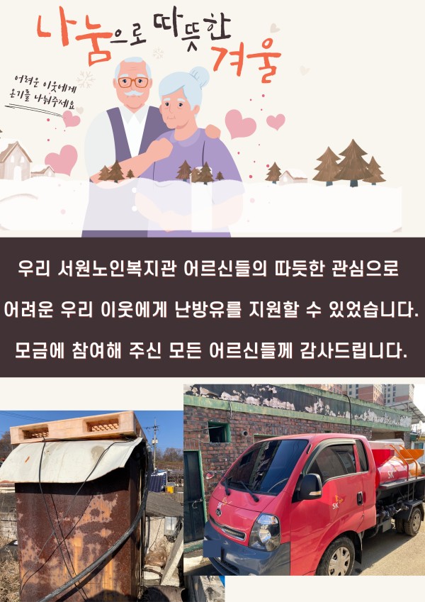 우리 복지관에서는 겨울철 난방유가 부족하여 어려움을 겪고 있는 어르신을 돋기 위해 복지관 회원 어르신들이 2022년 12월 한 달간 참여하는 모금활동을 진행하였습니다.