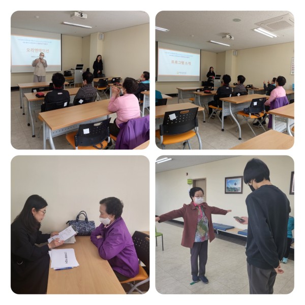 3. 30.(목) 진행한 1회기에는 오리엔테이션 시간으로 프로그램 일정 및 내용안내, 자기소개, 사전검사(일반적 사항, CIST 평가, CERAD-K, 신체기능평가(SPPB))가 이루어졌습니다. 참여 어르신들은 본인에게 꼭 필요한 프로그램인 것 같다며 기대되고 설렌다고 말씀해주셨습니다.