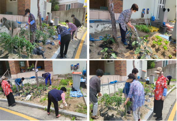 선배시민 자원봉사단 5회기는 복지관 텃밭에 자라고 있는 고추 모종들이 바람에 흔들려