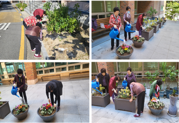 선배시민 자원봉사단 13회기는 어머님들과 함께 활짝 피어있는 꽃들 주변 흙을 고르게 펴주고 시든잎들을