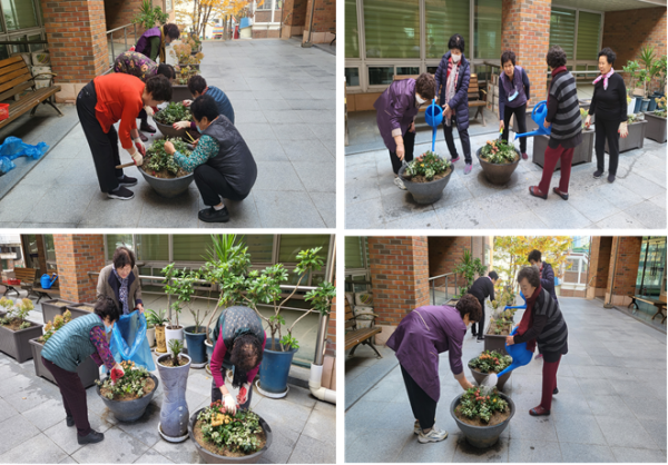 선배시민 자원봉사단 15회기는 추운 날씨로 시든 국화꽃잎들을 정리해주고 화단 주변을 깨끗하게 청소했습니다~! 시든 꽃잎을 정리해주면 시간이 조금 지난 후 예쁘게 다시 핀다는 사실을 아셨나요~? 다시 국화가 활짝 피어 환한 우리 복지관 화단의 모습이 기대됩니다~! 추운 날씨 어르신들 고생 많으셨습니다! 항상 감사드립니다~!