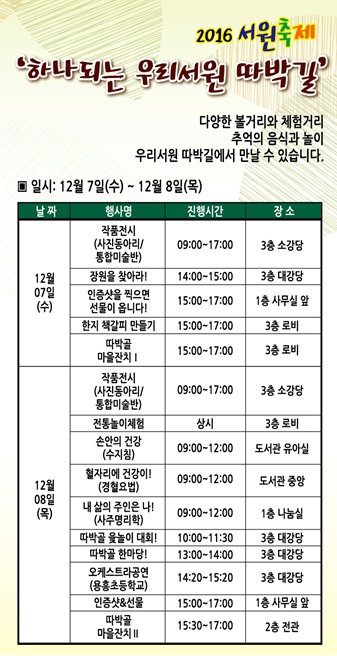 2016 서원축제 ■ 일시: 2016년 12월 07일(수) ~ 12월 08(목) ■ 장소: 서원노인복지관 전관 ■ 대상: 서원노인복지관 회원 및 지역주민 ■ 내용: 어울림 한마당 진행 ■ 주관: 서원노인복지관 |