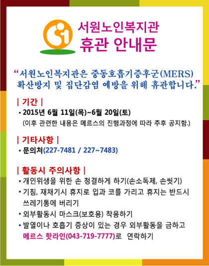 [긴급공지] 서원노인복지관 휴관 안내(중동호흡기증후군 확산방지)