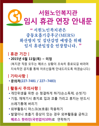 서원노인복지관은 메르스 확산방지 및 집단감염예방을 위해