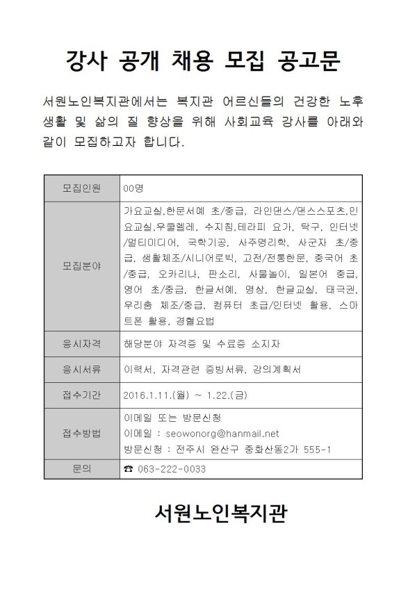 2016 사회교육 강사 모집 게시글 작성정보 작성자 서원노인복지관 작성일 16-01-06 00:00 조회수 1,318 댓글수 0 목록 게시글 본문 2016 사회교육 강사 모집 첨부파일 1개 2016 사회교육 강사 모집001.jpg (142.0K) 0회 다운로드 첨부일시 : 2016-01-06 00:00:00 이전글 [주간식단] 2016년 1월 둘째주(01.11~01.16) 복지관 주간식단 안내 16-01-11 다음글 [주간식단] 2016년 1월 첫째주(01.04~01.09) 복지관 주간식단 안내 16-01-04 댓글 0 등록된 댓글이 없습니다. 목록