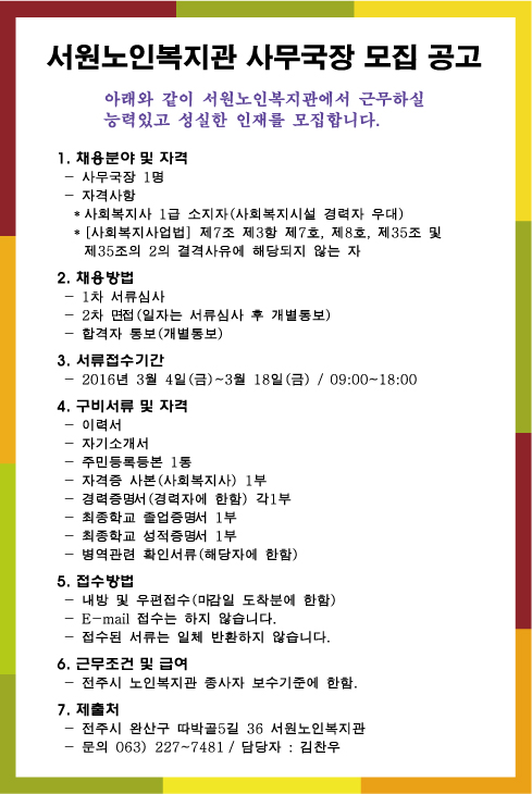 [모집공고] 서원노인복지관 직원모집(사무국장)