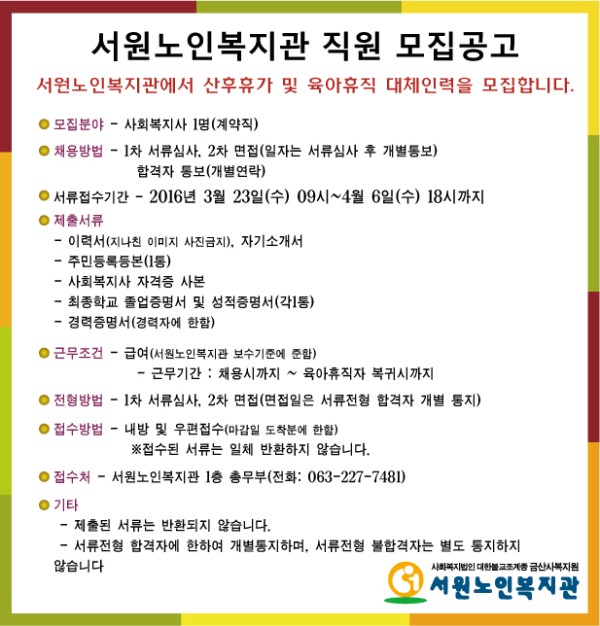 [모집공고] 서원노인복지관 직원모집(육아휴직 대체인력)