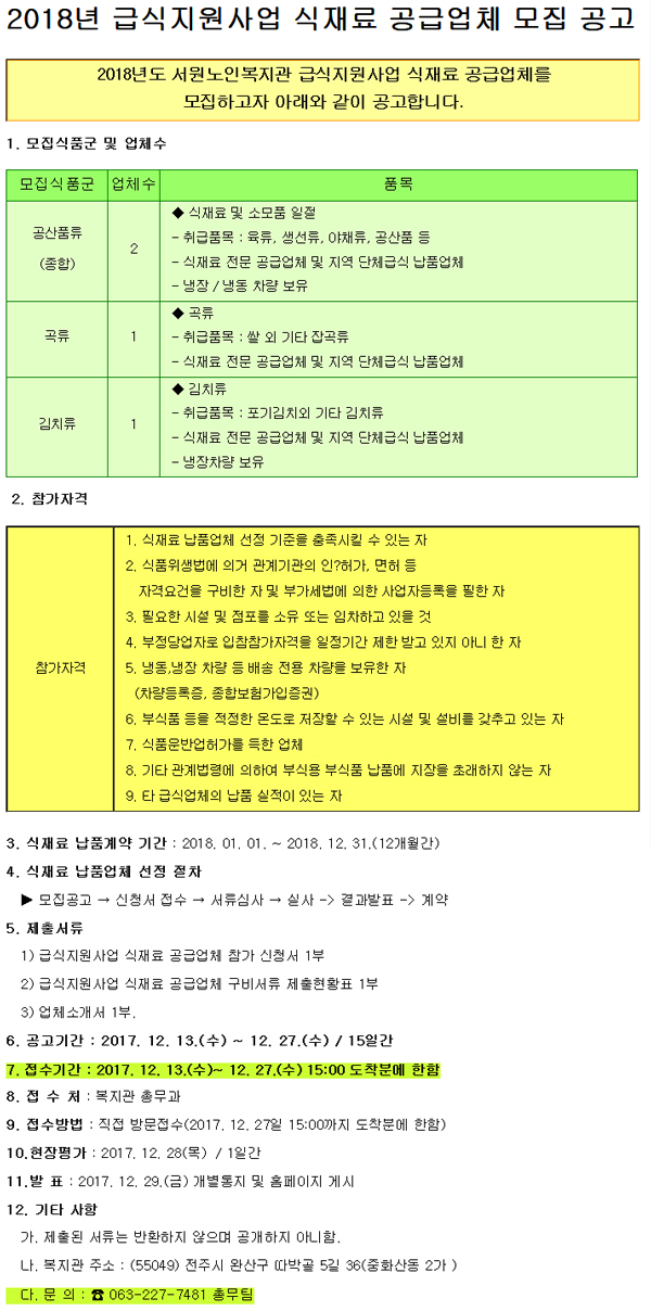 2017년 급식지원사업 식재료 공급업체를 모집합니다.
