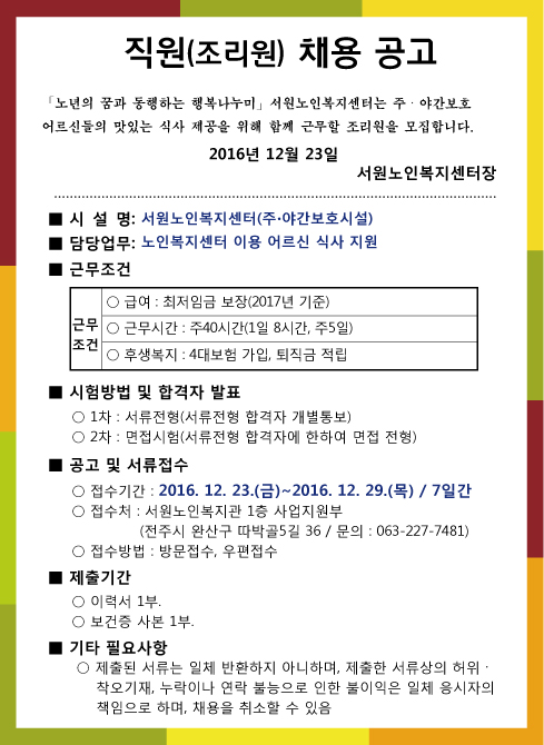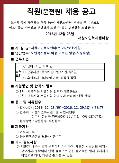 [모집공고] 서원노인복지센터 직원(조리원, 운전원) 모집