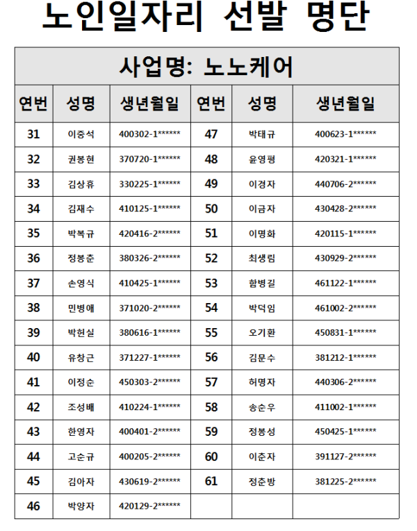 [노인일자리 및 사회활동지원사업 선발 관련]노노케어 사업단 선발자 명단