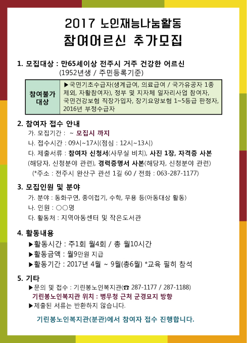 서원노인복지관에서는 2017년도 노인재능나눔활동에 함께할 참여어르신을 모집합니다.