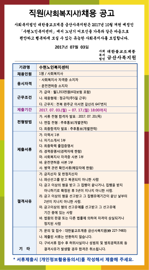 [직원모집] 금산사복지원 수현노인복지센터에서는 사회복지사를 모집합니다.