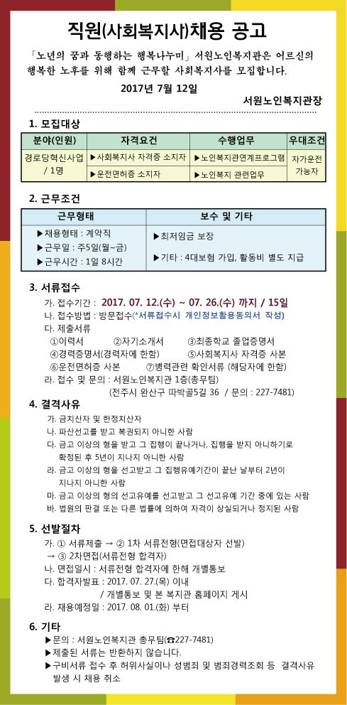 [직원모집] 서원노인복지관 직원(사회복지사) 모집-마감