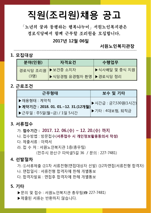 [모집공고] 서원노인복지관 직원(조리원 / 3명) 모집 안내