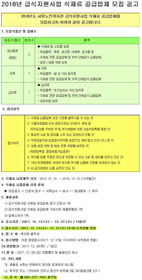 서원노인복지관에서는 급식지원사업 식재료 공급업체를 모집합니다.