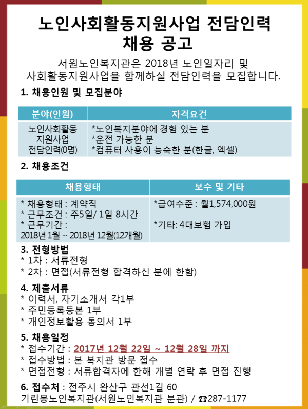 [모집공고] 노인사회활동지원사업 전담인력 모집 안내 게시글 작성정보 작성자 서원노인복지관 작성일 17-12-22 00:00 조회수 1,711 댓글수 0 목록 게시글 본문 노인사회활동지원사업 전담인력을 모집합니다. 첨부파일 2개 dfsdf.png (63.3K) 0회 다운로드 첨부일시 : 2017-12-22 00:00:00 2017년 직원채용 - 개인정보활용 동의서.hwp (15.0K) 15회 다운로드 첨부일시 : 2017-12-22 00:00:00 이전글 [안내] 2017년 서원노인복지관 기부금영수증 발급안내 17-12-26 다음글 [모집공고] 도시락배달 자원봉사자 모집 17-12-19 댓글 0 등록된 댓글이 없습니다. 목록