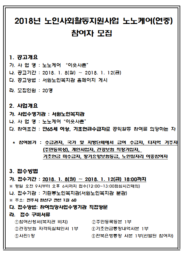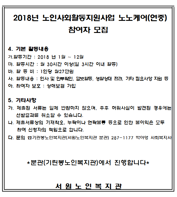 [모집공고] 노인사회활동지원사업(구, 노인일자리) 노노케어(연중) 참여자모집 -마감