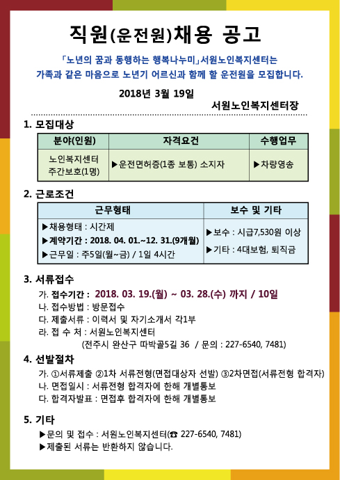 [모집공고] 서원노인복지센터(운전원 / 1명) 모집합니다 - 마감