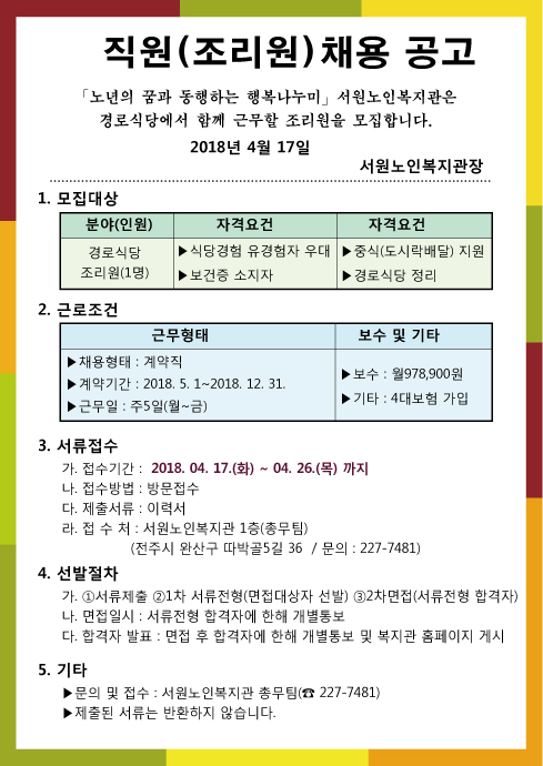 서원노인복지관은 함께 일할 경로식당 조리원을 재모집합니다.
