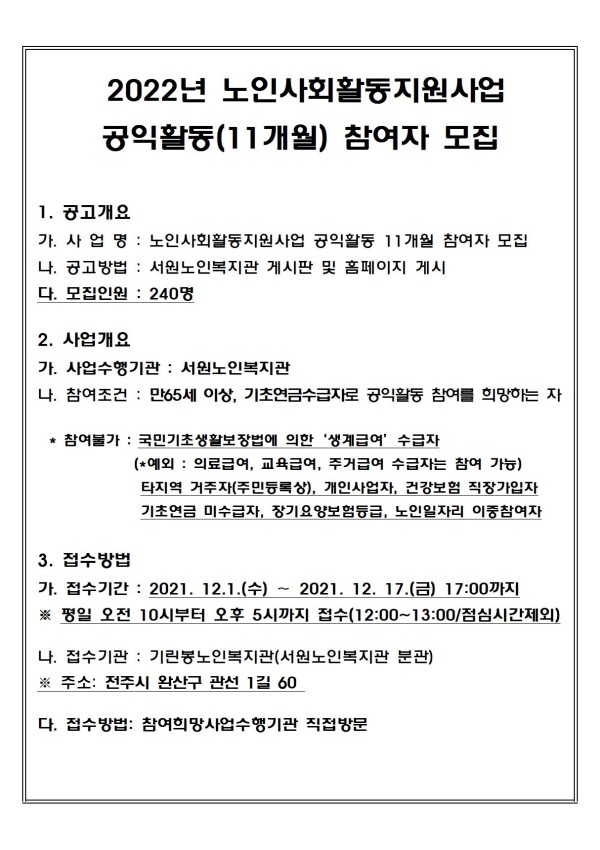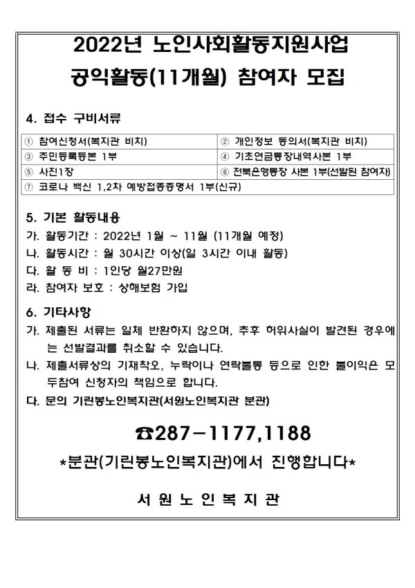 * * 위와 같이 서원노인복지관에서는 2022 노인사회활동지원사업 참여자를 모집하고자 하오니