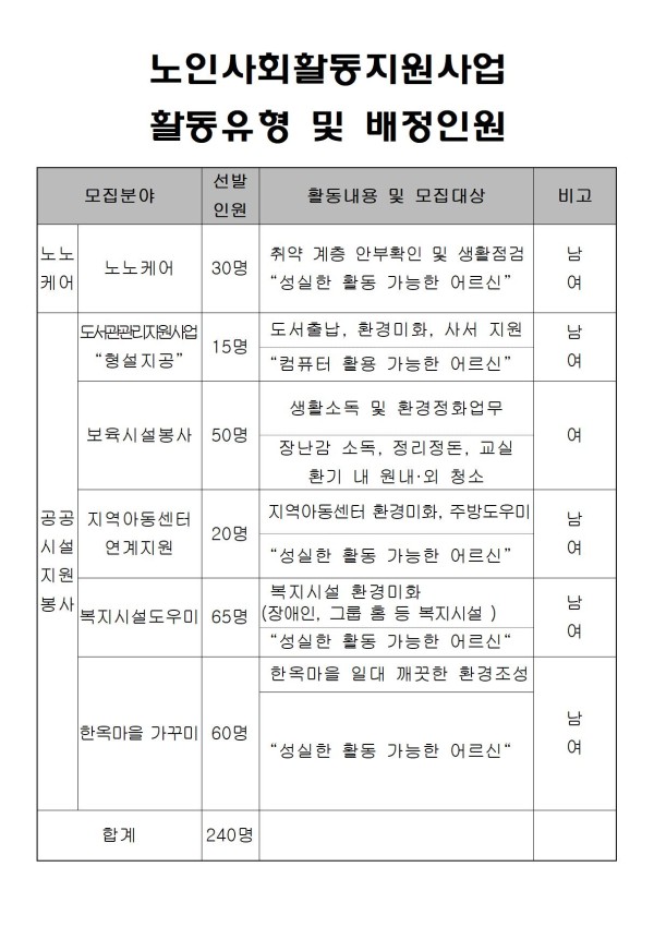 *노인사회활동지원사업 참여자 모집 (게시판 598)과 관련하여 참여자 활동 내용 및 배정인원 참고바랍니다.