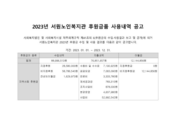 [후원] 2023년 서원노인복지관 후원금품 사용내역 공고 게시글 작성정보 작성자 서원노인복지관 작성일 24-03-25 13:07 조회수 809 댓글수 0 목록 게시글 본문 첨부파일 2개 홈페이지 공고 서식.jpg (159.7K) 0회 다운로드 첨부일시 : 2024-03-25 13:07:00 2023년 후원금 수입 및 사용결과보고서원노인복지관 - 완성본 - 시트보호.xlsx (168.3K) 39회 다운로드 첨부일시 : 2024-03-25 13:07:00 이전글 [휴관 안내] 제22대 국회의원선거(4.10.수) - 복지관 휴관합니다 24-04-05 다음글 [예산 공개] 2024년 서원노인복지관 1차 추경 예산 공개 24-03-18 댓글 0 등록된 댓글이 없습니다. 목록