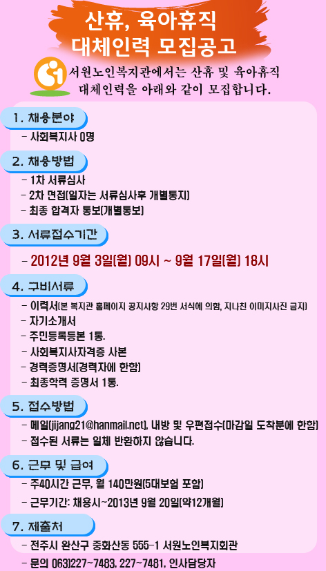 서원노인복지관에서는 산휴 및 육아휴직 대체인력을 아래와 같이 모집합니다.